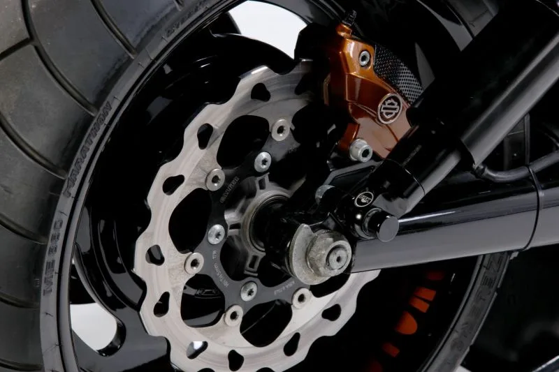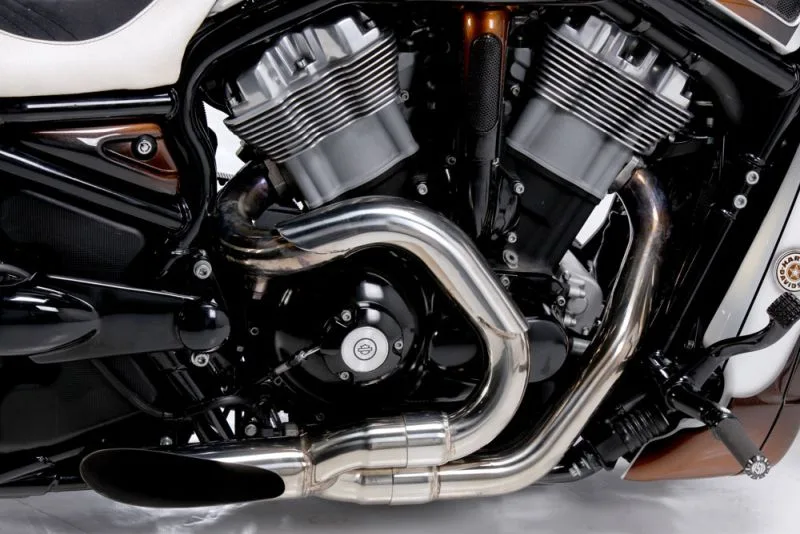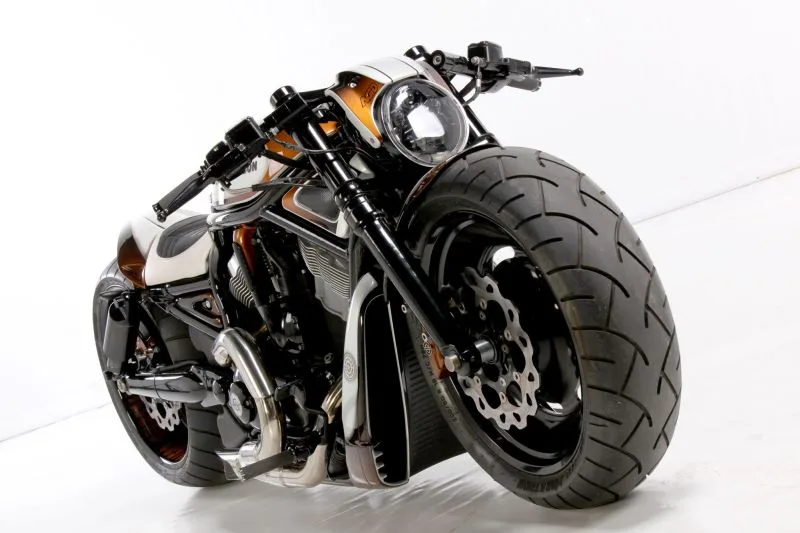 The front-end modifications, including custom-made triple trees and shortened front legs, contribute to the VRod’s aggressive stance and responsive handling.