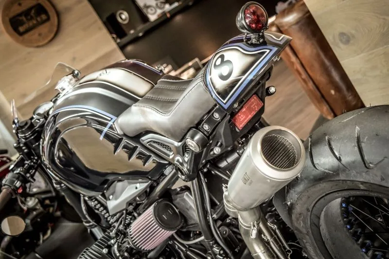 Air/oil-cooled two-cylinder, four-stroke boxer engine with two camshafts and four radially-arranged valves per cylinder as well as central counterbalance shaftBore x stroke