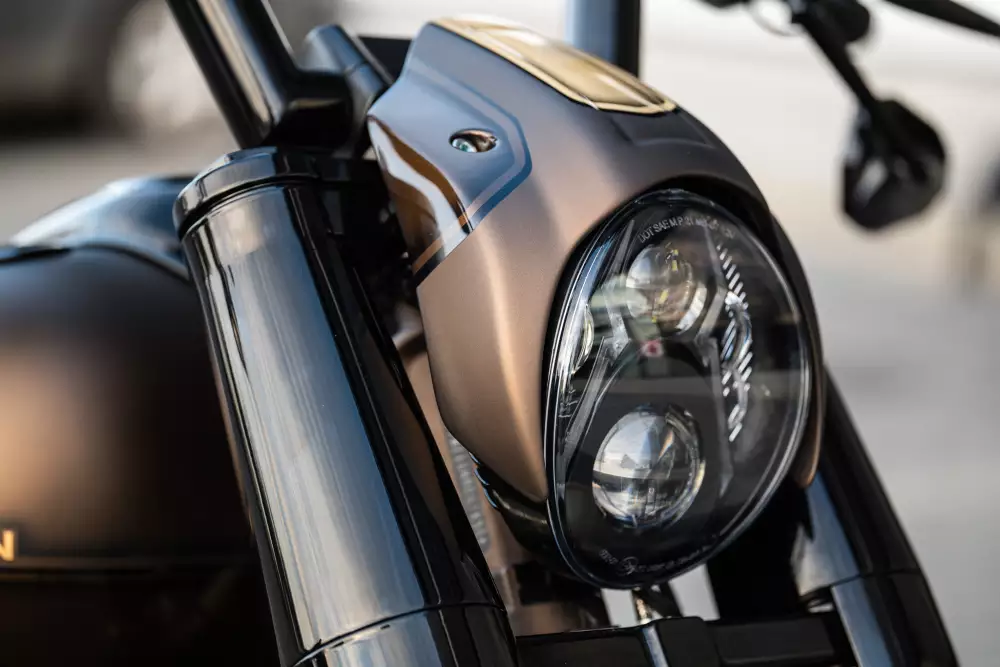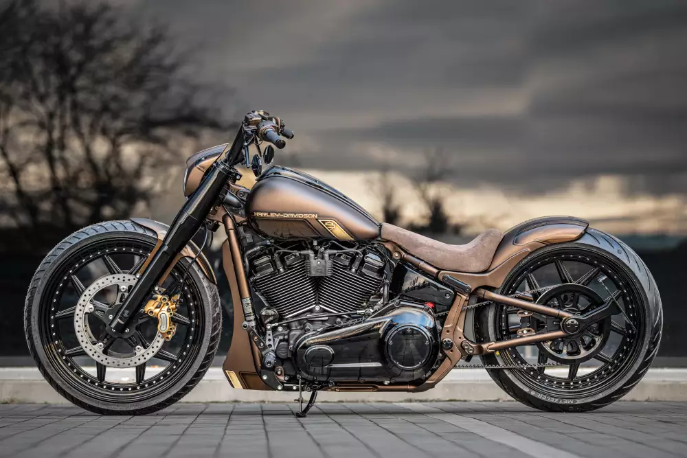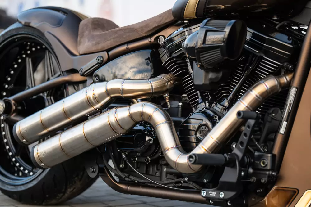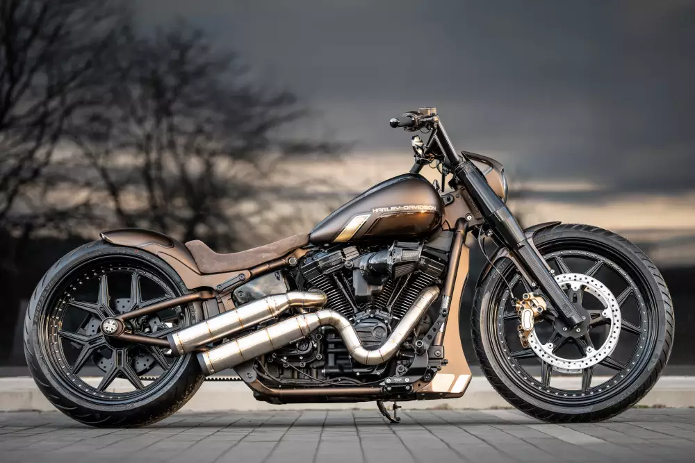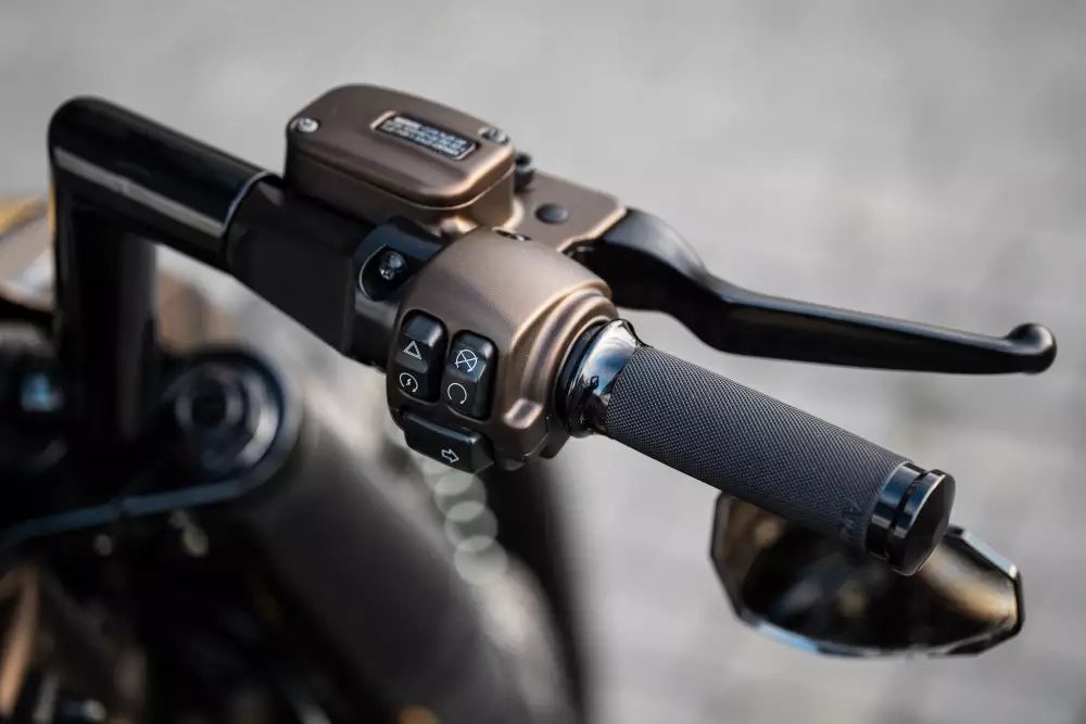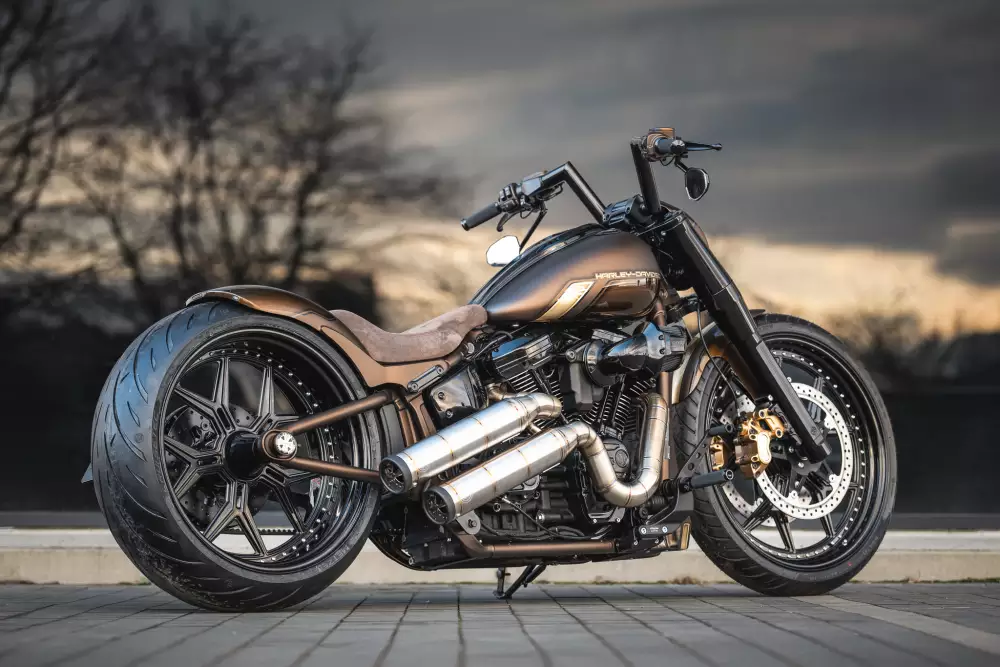 This custom FXST immediately grabs attention with its low-slung silhouette, oversized rear wheel, and precision-engineered exhaust system. The sculpted lines of the bike flow seamlessly from front to back, enhanced by a deep metallic bronze finish that shifts beautifully under the light. The custom star-pattern wheels, paired with a massive rear tire, reinforce its muscular and dominant character.