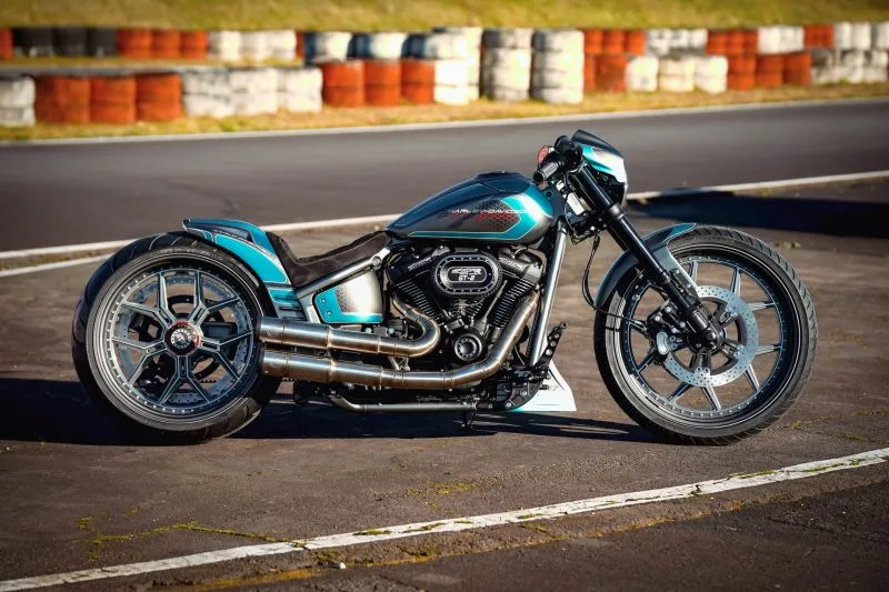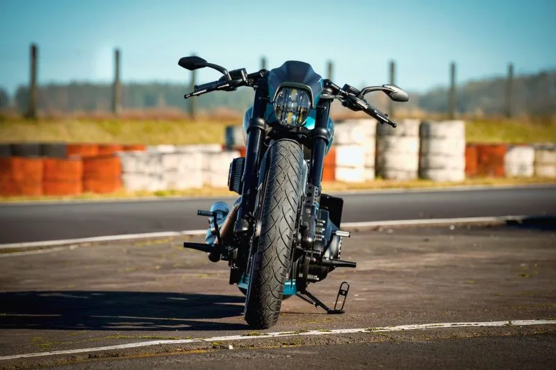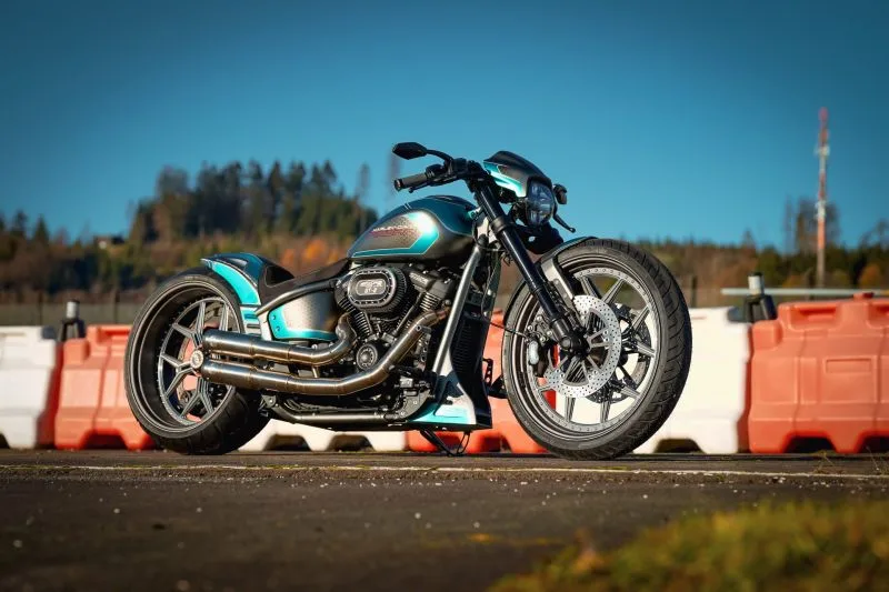 The fact that the bug and tail of that Softail FXDR look like a single piece, even though there are many individual parts, is the result of countless hours of manual work. The front spoiler has 17 parts and the rear even 22 parts that have been welded, tinned and merged into one unit. We also developed the triple clamps especially for the 23″ wheel with upside down fork.