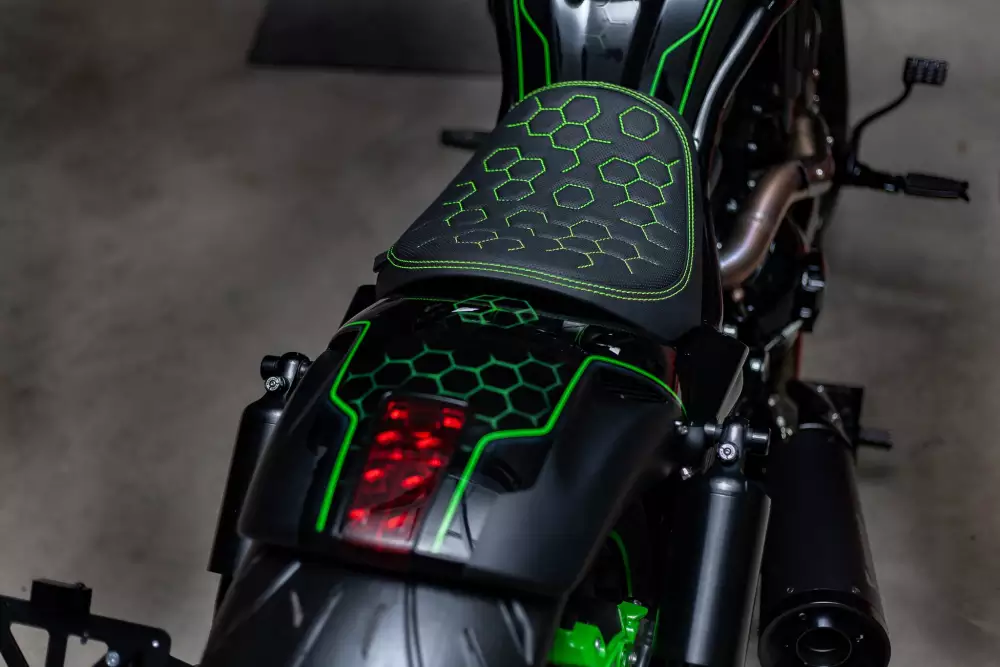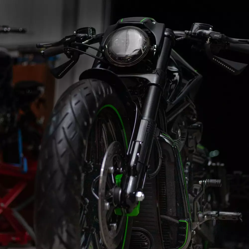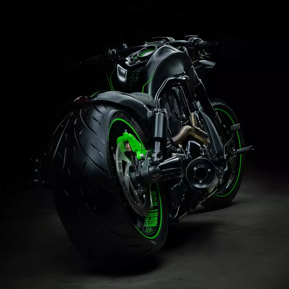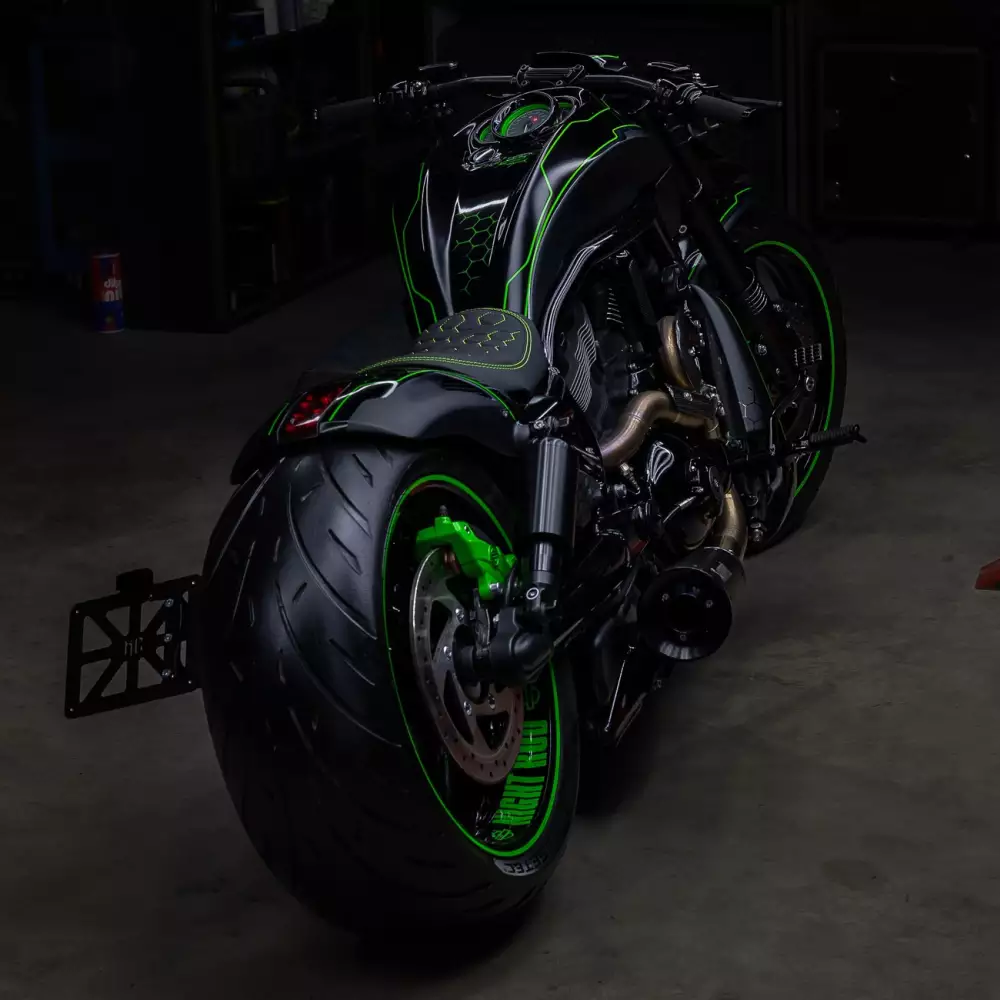 A massive 260 rear tire ensures a muscular presence on the road, while the green color scheme and precision-executed graphics—a mix of matte and gloss clear coats—by Picasso Airbrush & Custom Paint give this build a unique personality and visual punch.