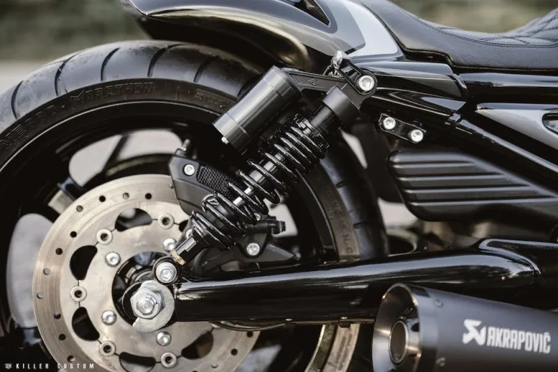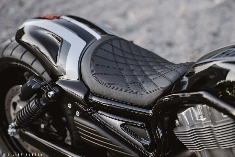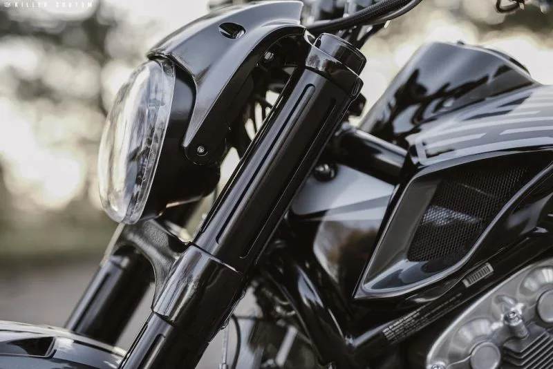 Most of the parts we use on our builds are manufactured by us, so shop this look below without spending tons of money to get the same aggressive look! Almost on all of our builds we use the same handlebar, grips, front fork covers, and lowering kits, as it always works to get that mean look of the V-Rod!