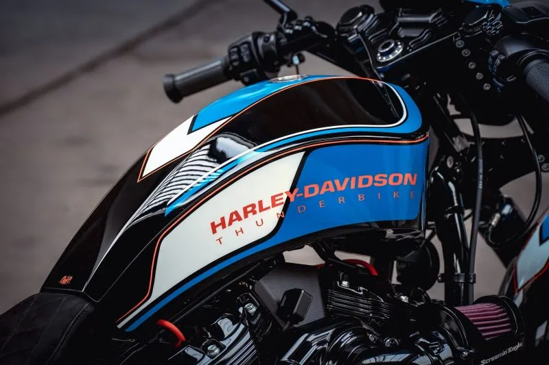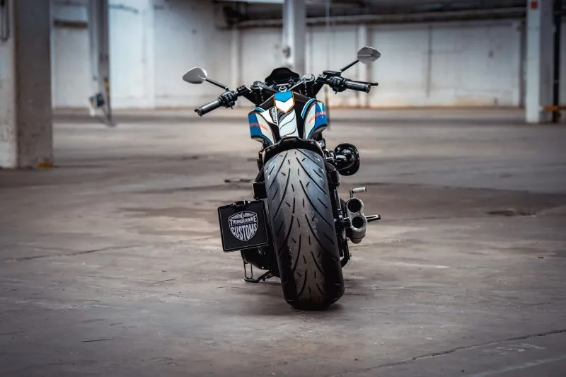 Thunderbike took inspiration from their Razorback model, known for its razor-sharp edges and the seamless line that runs across the tank, fenders, and spoiler from their GP Style series.