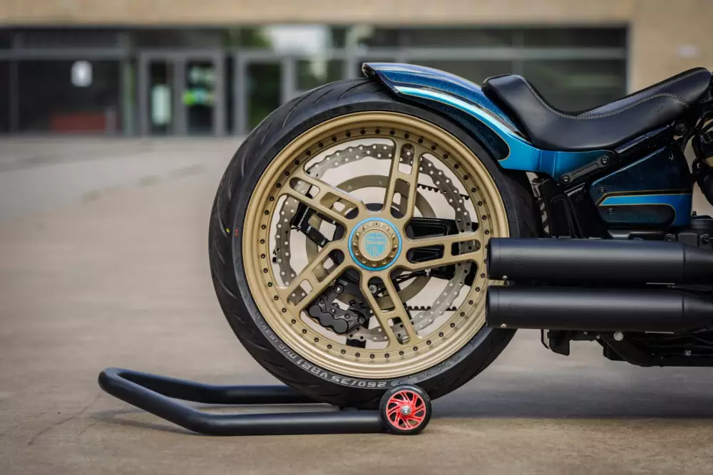 The transformation is immediately visible thanks to the Thunderbike Big Speed wheels. The setup features a 23-inch front wheel paired with a 21-inch single-sided rear wheel, wrapped in Metzeler Cruisetec 260/35VR21 and Metzeler ME888 130/60B23 tires. The Thunderbike single-side swingarm kit not only exposes the wheel visually, but also gives the Fat Boy a clean, show-bike rear profile. Braking performance is enhanced with a Thunderbike Big Speed 340 mm brake disc, pulley, heavy-duty 1-inch belt, and caliper adapter.