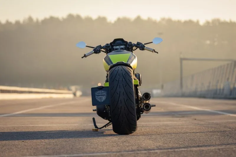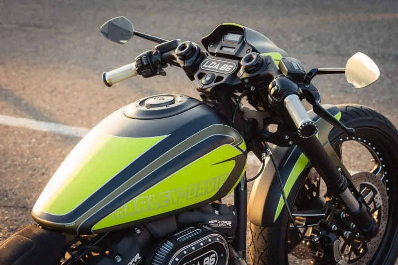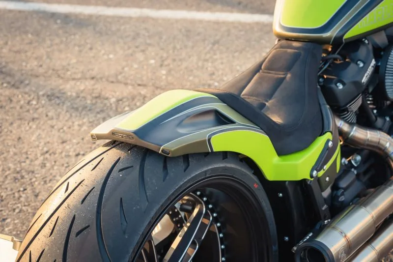 What makes this bike, however, are our matched components: Single-sided swingarm, big wheels, lowered front and rear, rear fender with lights, side license plate, nose spoiler and various black covers. And yes, of course we beefed up the powerful Milwaukee-Eight 114 engine with the torque kit (Screamin’ Eagle Stage II) and the big air cleaner and tuned it with DON Performance.