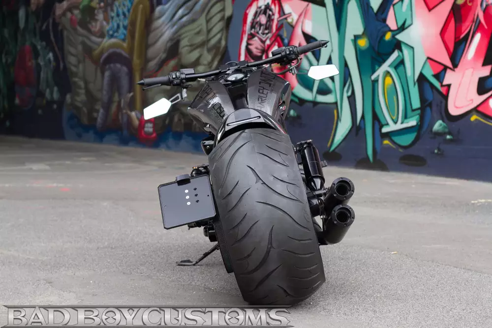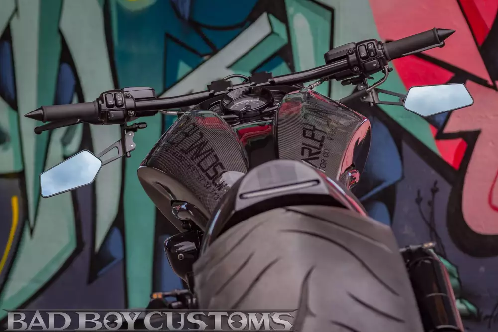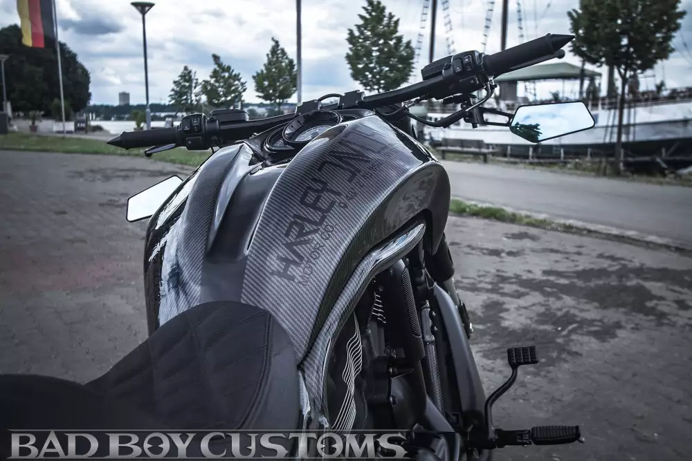 What really sets this machine apart is its carbon-look paint finish, meticulously applied by Bad Boy Customs. The carbon effect gives the bike a stealthy, high-tech appearance that perfectly complements its dark and muscular silhouette. Combined with its wide rear tire and low stance, it delivers a look that’s both futuristic and intimidating.