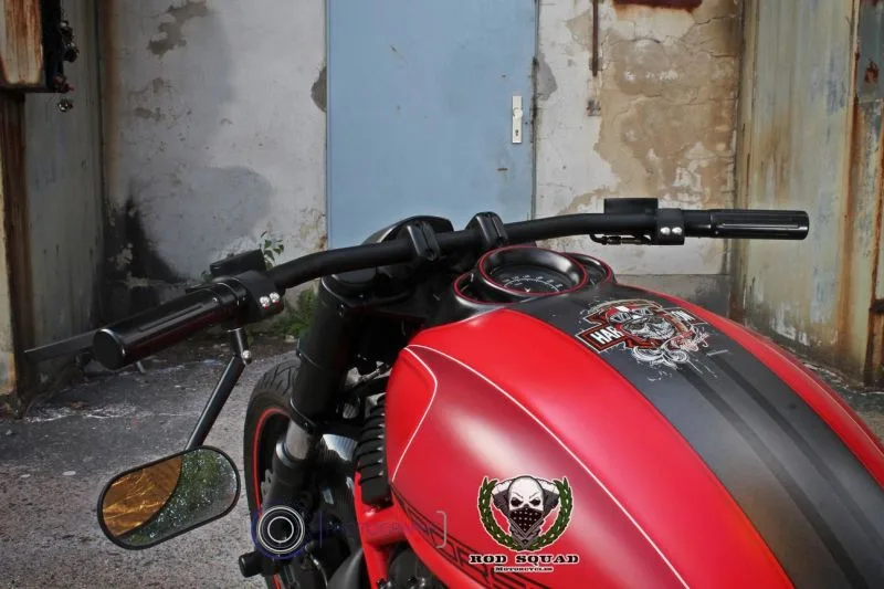 A Müller internal throttle system is used, and the grips from Speed Demon are modified to match the overall style. The motorcycle features a completely rebuilt wiring harness, with the engine control unit moved to the front, and all main functions are controlled through four discreet buttons. A hidden starter button and a speedometer converted to red illumination enhance the sleek custom appearance.