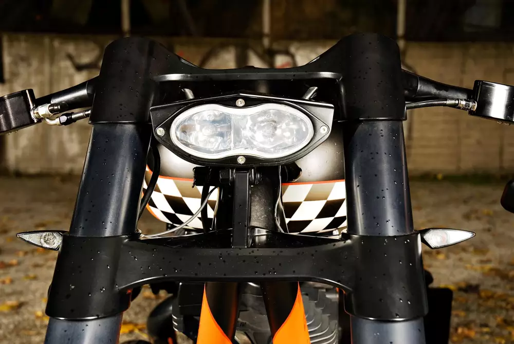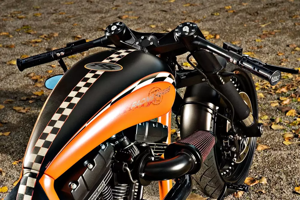 The paintwork gives the RS-O its final personality. The design idea was created by Andreas Bergerforth and airbrush artist Ingo Kruse. The color combination of matte black and orange with racing checkered graphics highlights the drag racing style of the bike. The finish looks clean, fast and very purposeful.