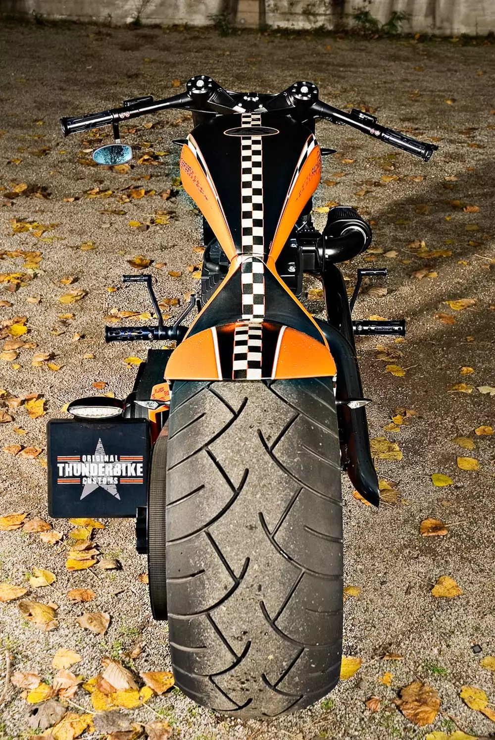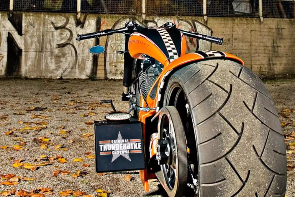 The chassis underlines the performance character of the bike. At the front, a TB-RS upside-down fork with 4 degrees of rake gives the motorcycle a compact appearance and precise handling. Thunderbike also produces the handlebars, grips and front fender. A 130 Metzeler tire sits on a TB Vegas Cut 4.5×18″ wheel, and braking is handled by an ABM radial caliper together with a 300 mm TB-Spoke brake disc.