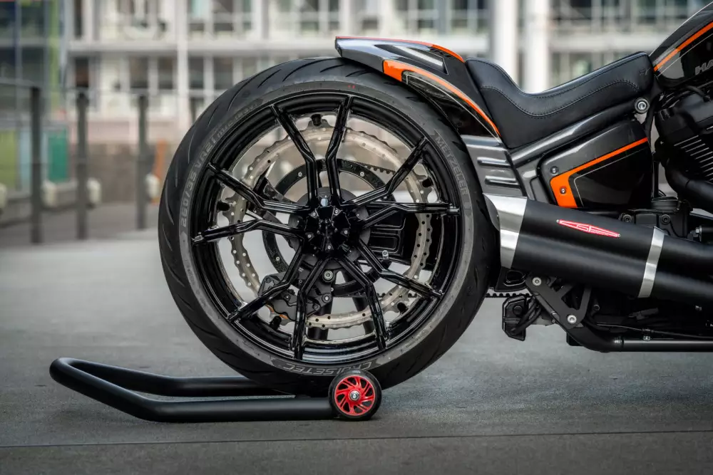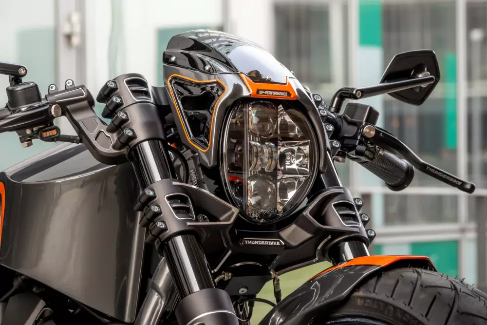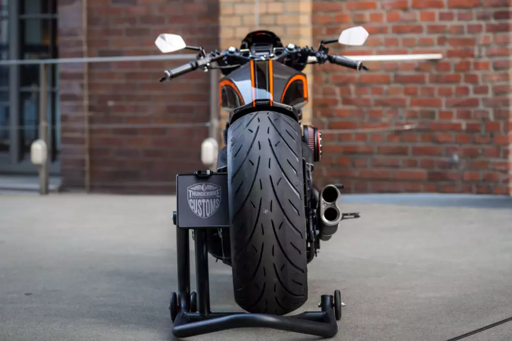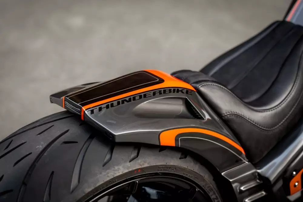 This machine rolls on Thunderbike Grand Prix wheels — a 9.0×21 rear and 4.0×23 front, wrapped in Metzeler Cruisetec 260/35VR21 and ME888F 130/60B23 tires for an aggressive stance and unmatched grip. The Single-Side Swingarm Kit (21″ Alu) exposes that massive rear wheel, emphasizing the performance-driven design.
