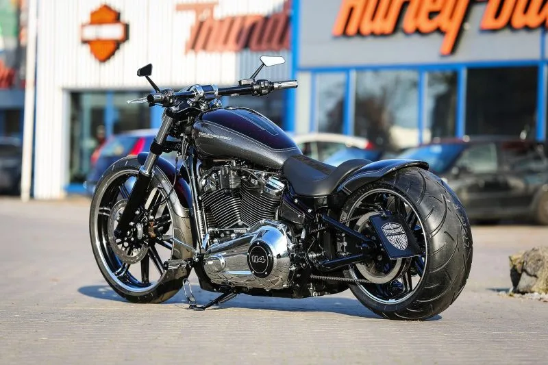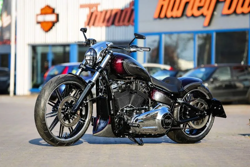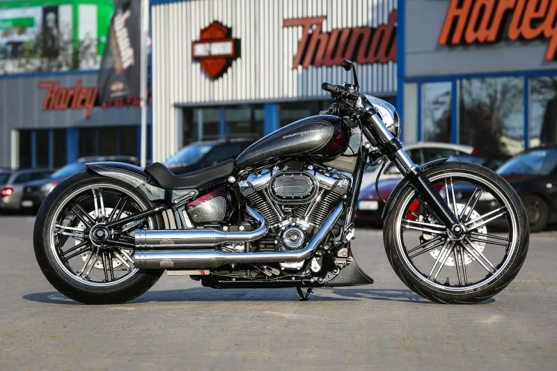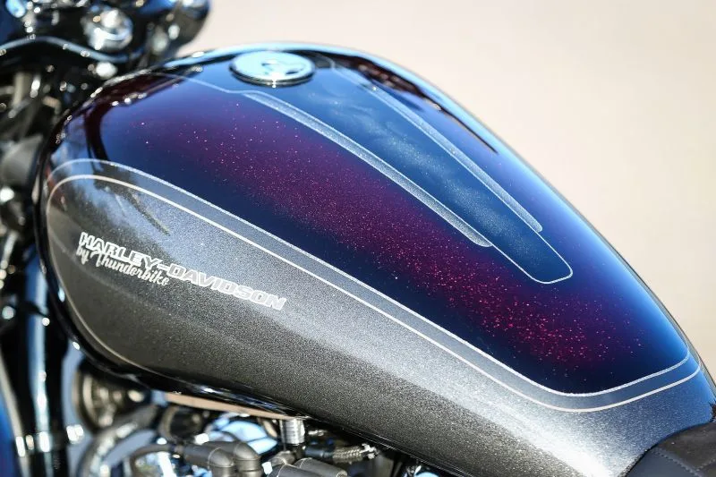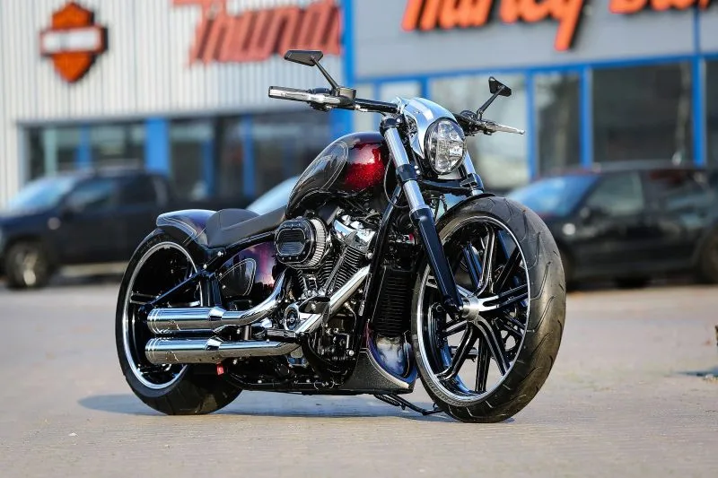Since 2013 the Breakout model in drag look decorates the Softail series and offers for us again and again the ultimate basis for the conversion. This Milwaukee-Eight conversion got the complete range of Thunderbike parts from us. As the name Purple Grace suggests, the bike is decorated with purple metal flake contrasts. The paintwork was done by none other than our master painter Ingo Kruse from Kruse Design.