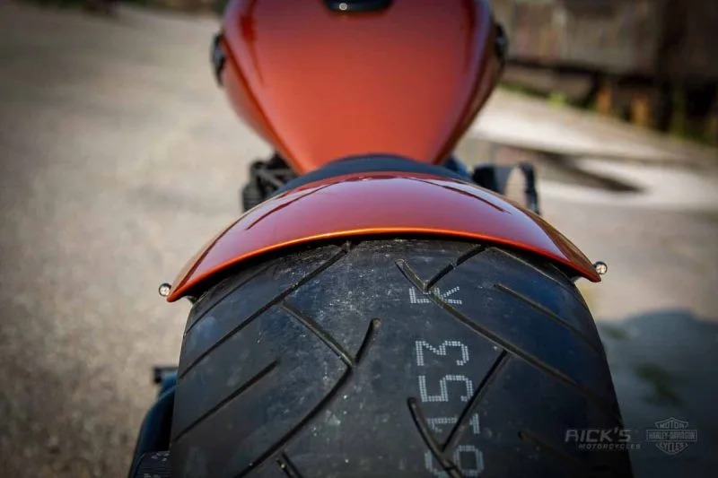 Beyond the 300 tire, the bike features black “Classic Steve” forged wheels, a custom steel rear fender, and a stretched stock tank reshaped to flow smoothly over the engine. Rick’s also created new steel front fenders for all 2018+ Softails.