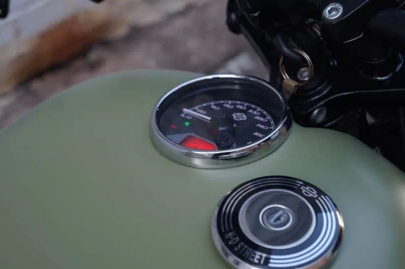 - GAUGES 3.5 inch electronic speedometer with high beam, neutral, low oil pressure, turn signals, engine diagnostics, low fuel warning, blade key ignition and fork lock, and locking gas cap