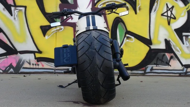 The build features a widened 10×18 rear wheel fitted with a massive 280 Avon tire (BBC 012), giving the bike a bold and powerful rear stance. Complementing that setup is a rear fender (BBC 090) and an airbox cover with air inlets (BBC 024) that seamlessly integrate with the bike’s aerodynamic flow. The short front fender (BBC 036) adds a sporty edge, while axle, swingarm, and engine screw covers contribute to the bike’s clean, detailed finish.