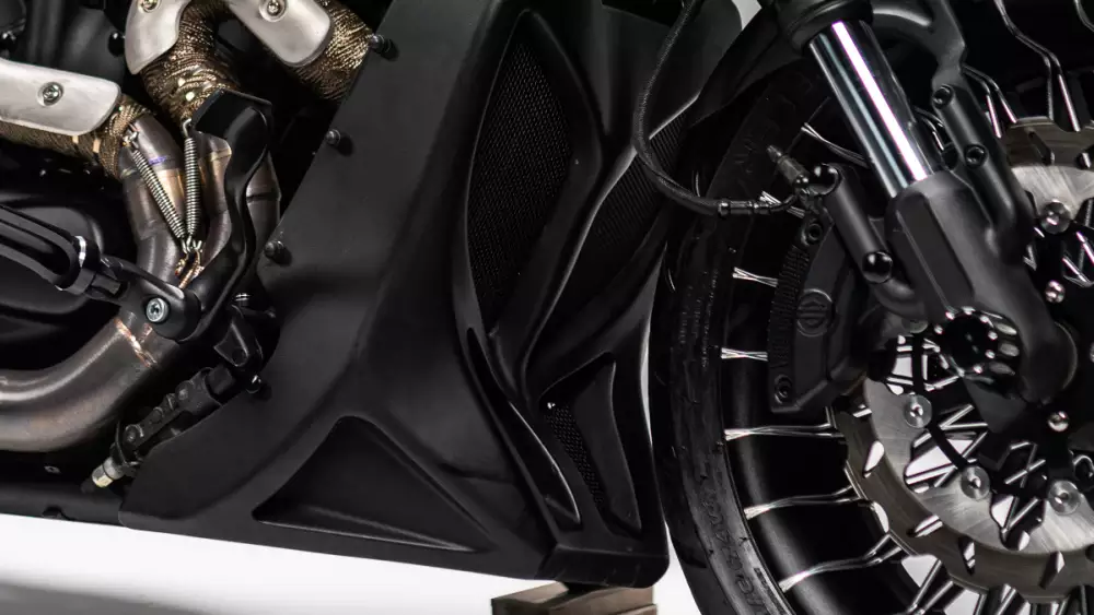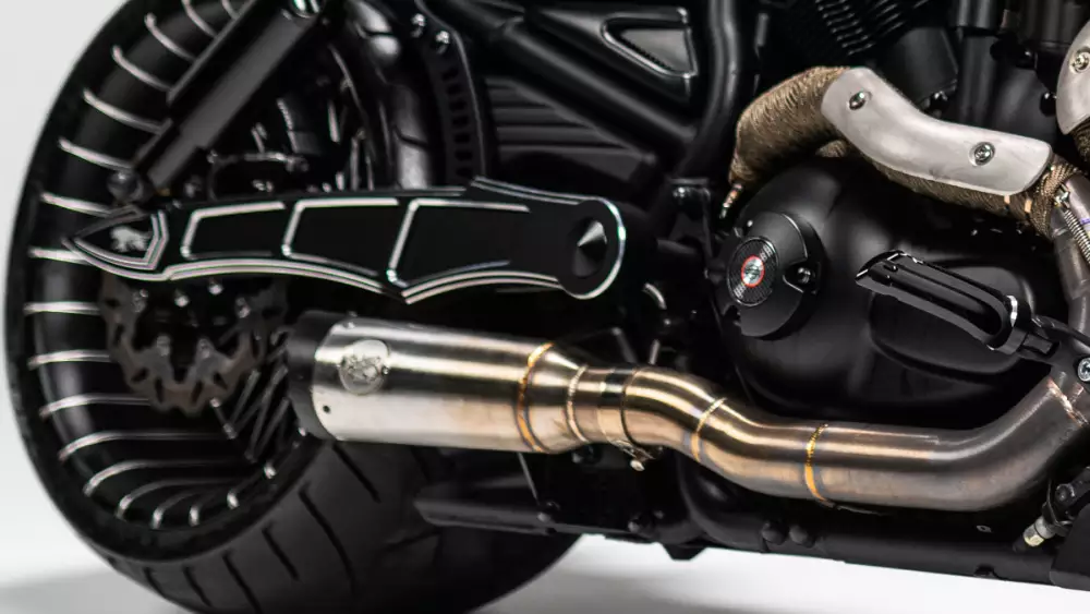 The chassis and geometry define the aggressive yet fluid stance of the motorcycle. A custom double swingarm configuration sets the foundation for extreme stability and visual impact, while CNC-machined body components give the bike a sculpted, architectural presence. An advanced air ride suspension system allows precise control over ride height and posture, blending performance functionality with a striking low-profile silhouette when at rest.