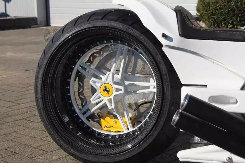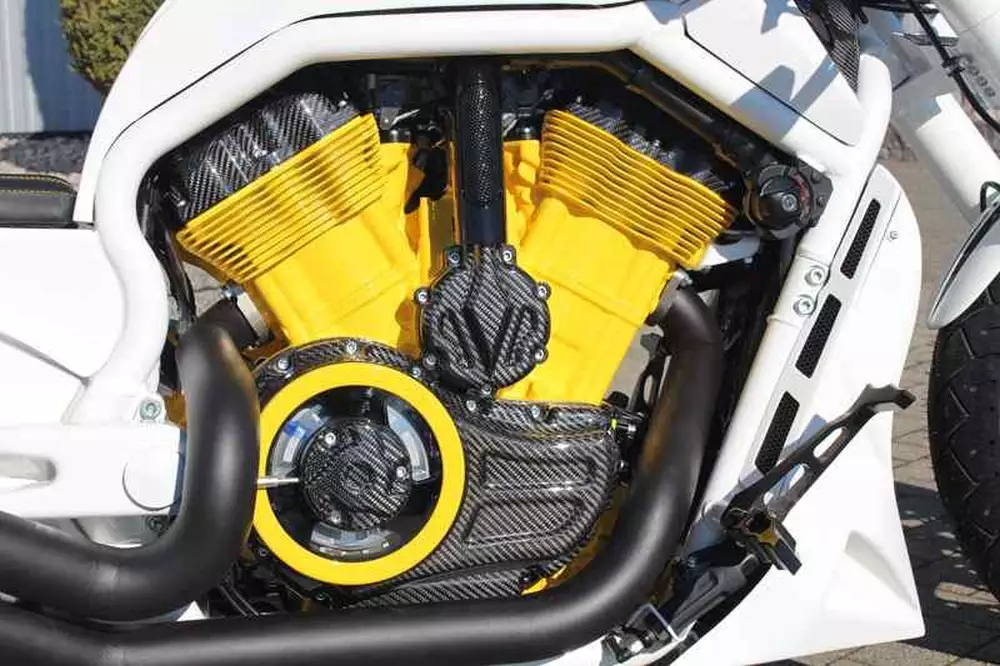 The motorcycle is painted in a sleek white color, with the wheels also painted in white for a unified look. The real star of the show, however, is the motor, which is painted in a striking yellow color with carbon details.