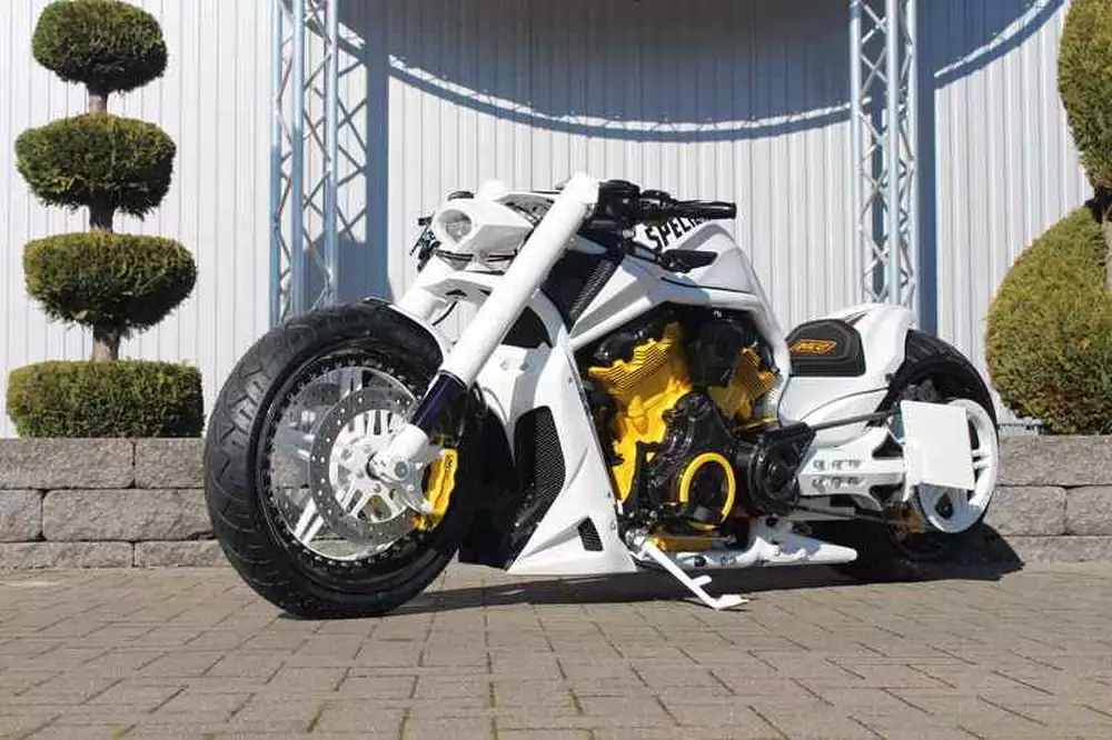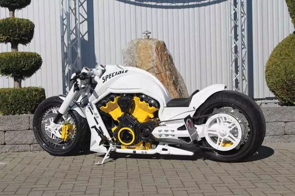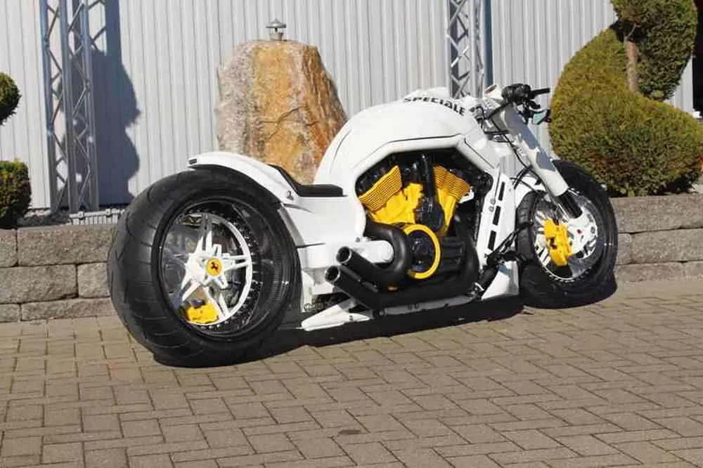 The tires used for the V Rod Speciale are Metzeler Marathon 280/35 R18, which provide excellent stability and grip on the road. The motorcycle also features an incredible exhaust system, a 2-in-2 Black creation by No Limit Custom that adds both a sleek look and powerful sound to the motorcycle.