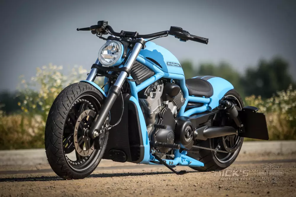 The Harley-Davidson V-Rod “Flyin’” by Rick’s Motorcycles is a striking custom bike with a low stance, wide rear tire, and a bold blue finish.