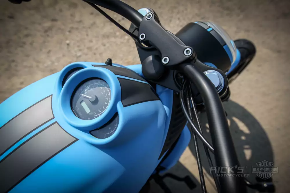 The custom paintwork by Rick’s Motorcycles makes the “Flyin’” instantly recognizable. The bright blue body contrasts with the blacked-out engine and chassis parts, highlighting the curves and proportions of the bike. Every detail reflects precision, craftsmanship, and true custom spirit.