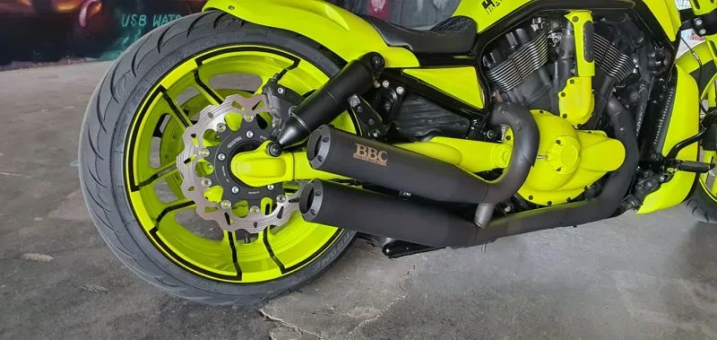 The Harley Night Rod 300 comes equipped with airride suspension, which offers a more comfortable and smooth ride compared to traditional suspensions. The exhaust system is custom-made by Bad Boy Customs and is a 2 in 2 black design, adding to the sleek look of the whole bike.