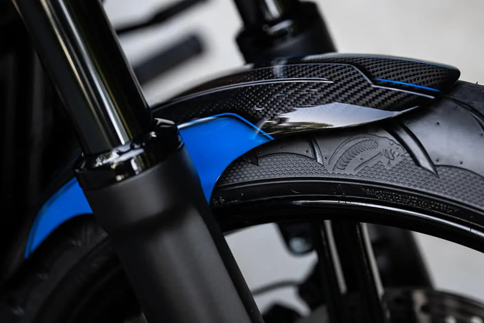 The first thing that catches the eye is the spectacular blue finish with carbon fiber detailing. The color is deep and rich, and perfectly complements the muscular design of the motorcycle. The aesthetics don’t stop there, however.