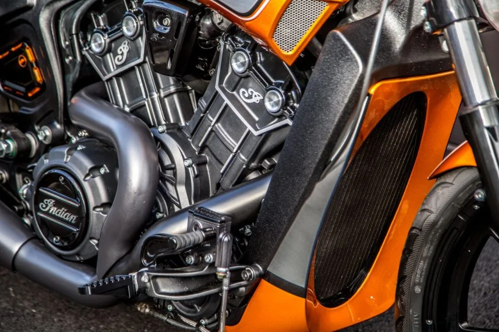 For a riding position more suitable for the drag racing style, inverted Biltwell handlebars, a saddle kit from Wunderkind and a riser provides a more linear position. The intake is completely open to let the Scout breathe through a Trask Performance filter with a Freedom performance exhaust and Samco Performance reinforced water hoses handle the coolant. Riding on Arnott pneumatic shock absorbers and rims from Revtech fitted with Avon Cobra Chrome tyres, braking is taken care of with Galfer petal discs.