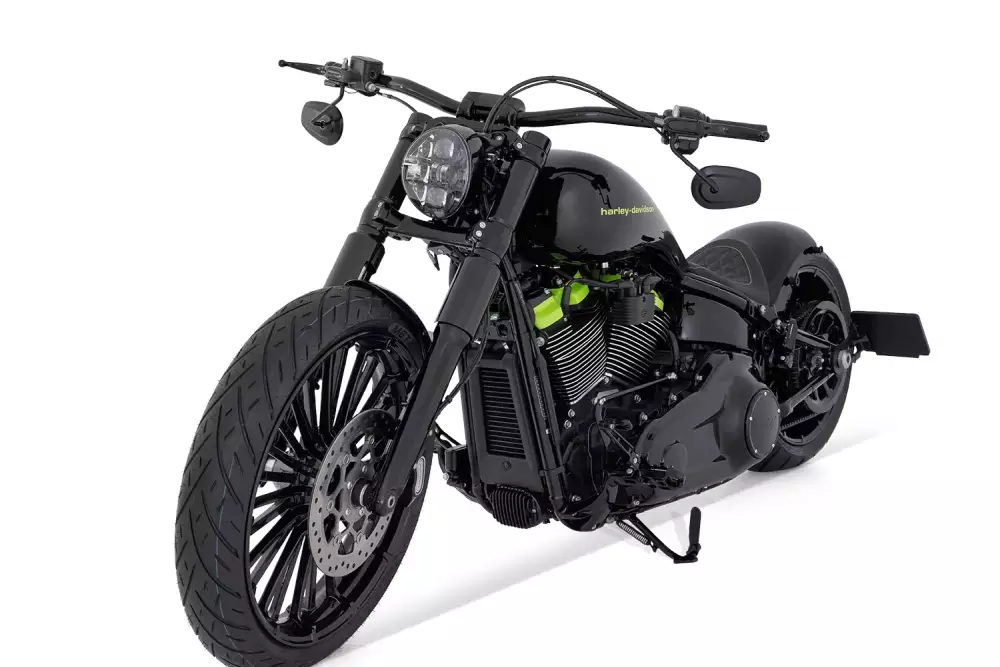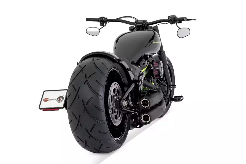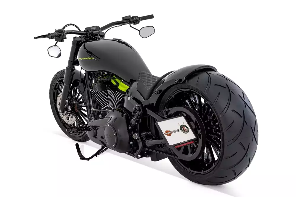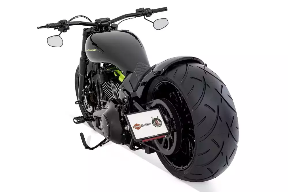 Visually, IRON MESH is defined by the contrast between deep gloss black and vivid toxic green. The high-gloss black fuel tank is accented by a bold green Harley-Davidson logo, creating an instantly recognizable and iconic look. Matching green powder-coated engine covers are heat-resistant and precisely aligned with the tank design, emphasizing the build’s attention to detail and quality. Gloss black powder-coated wheels and components complete the finish, offering both elegant appearance and exceptional durability under demanding conditions.