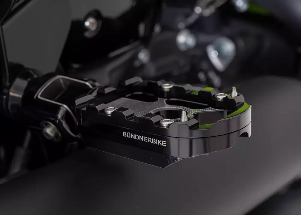 CNC-machined aluminum hand grips by Bündnerbike provide a secure grip, precise control, and a premium tactile feel. Their ergonomic shape and high-quality finish reflect the machine aesthetics that define this build. Matching CNC-machined foot pegs for both rider and passenger offer excellent stability and comfort, combining durability, functionality, and refined style.