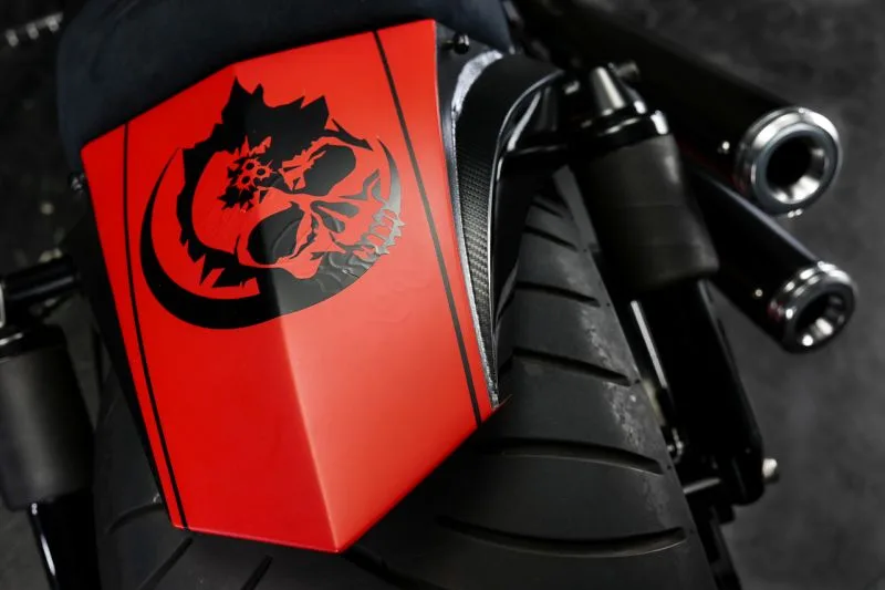 The paint of the Harley FXDR Custom ‘EVO GP-Style’ by Bad Land from Japan is from Naturally Custom Paint. This gives the motorcycle a unique look that sets it apart from other motorcycles on the road.