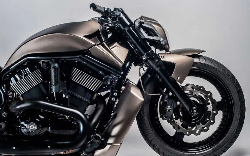 The front end features an angular custom headlight and inverted forks, enhancing both handling and visual aggression. The large performance brake rotors and lightweight wheels emphasize control and braking power at high speeds. A custom exhaust system flows along the side of the bike, giving the V-Rod an unmistakable deep and powerful sound.