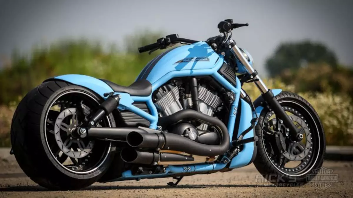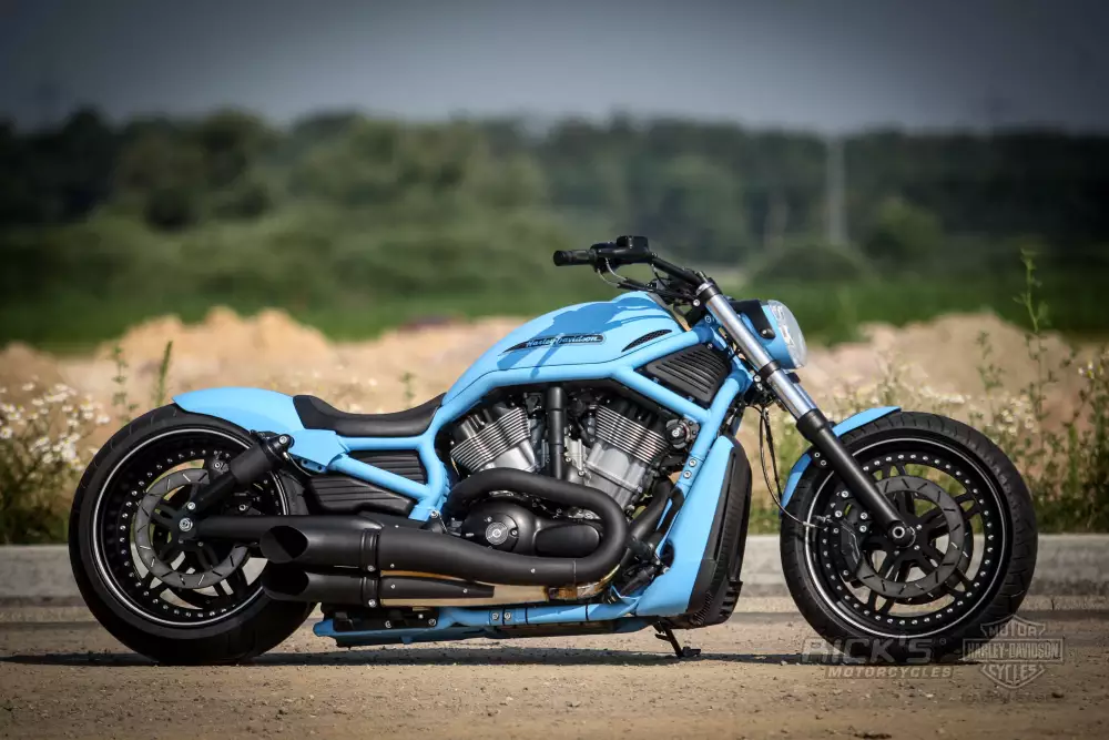 The Harley-Davidson V-Rod “Flyin’” by Rick’s Motorcycles is a striking custom bike with a low stance, wide rear tire, and a bold blue finish.