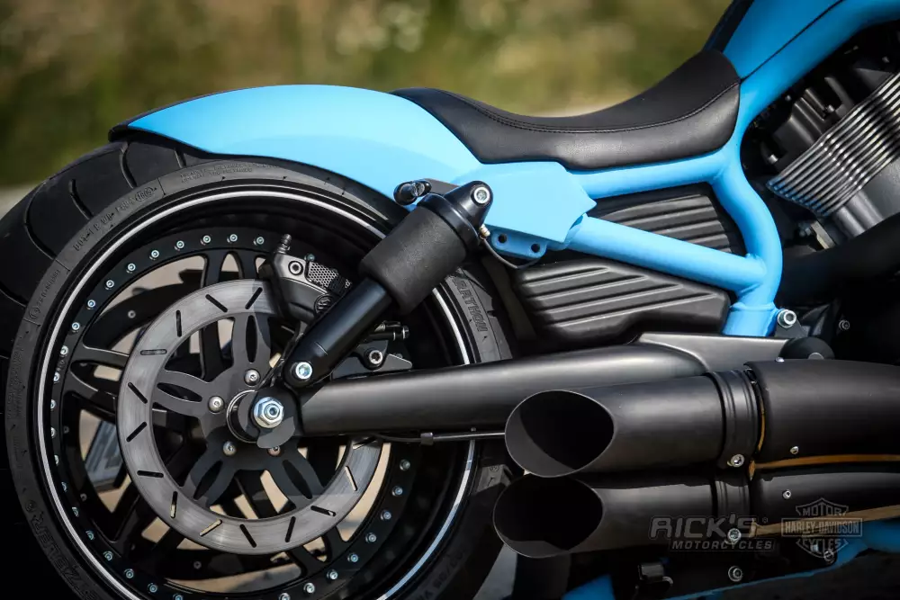 The front fender and rear fender on this Harley Davidson V Rod are both made by Rick’s Motorcycles. The rear fender, known as the Short Cut “RACE” 280, adds to the bike’s sleek and streamlined appearance.