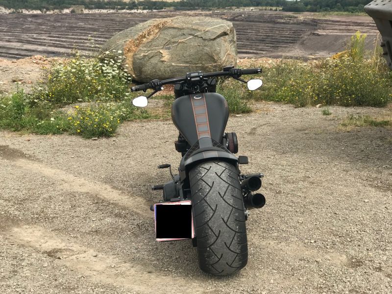 Performance and aesthetics come together through a Supertrapp 2-in-2 black exhaust system, enhanced with heat wraps for a raw, mechanical look. The front is dominated by a No Limit Custom VR 5000 headlight, adding a modern and aggressive expression, while Kellermann 3-in-1 Rhombus indicators provide turn signal, brake light, and tail light functions in a compact, stylish unit.