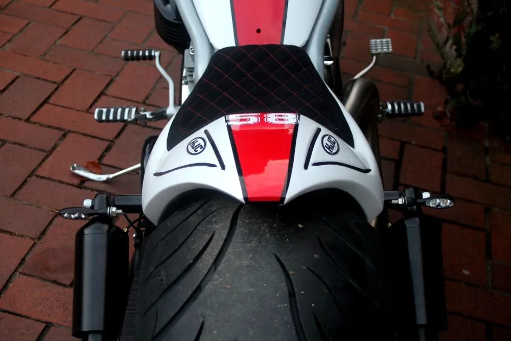 Custom Seat: Featuring carbon leather edging, perforated inlay, Alcantara seat, and decorative stitching.