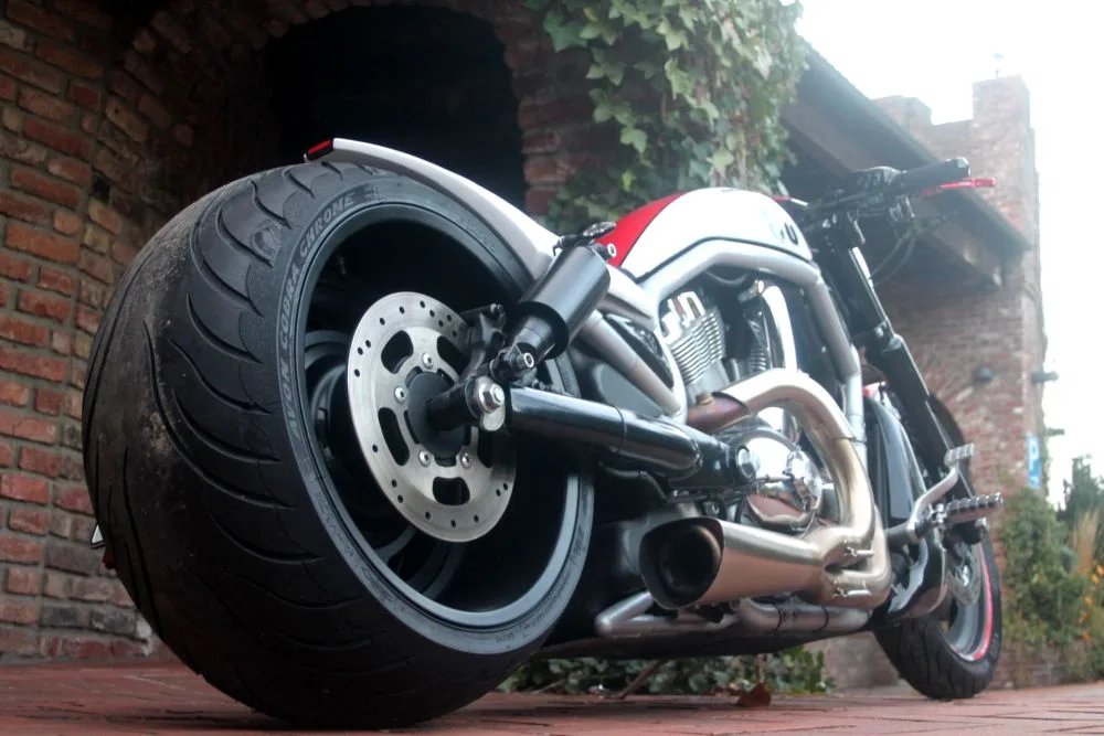 The Harley-Davidson V Rod “Murciélago” by X-Trem is a striking custom build that blends aggressive design with high-performance components. Its bold stance is defined by a set of three-piece Stealth wheels, measuring 11 x 18 at the rear and 4.25 x 18 at the front, wrapped in Avon Cobra tires sized 300/35 R18 and 130/70 R18. This massive rear setup gives the bike its unmistakable silhouette and road presence.
