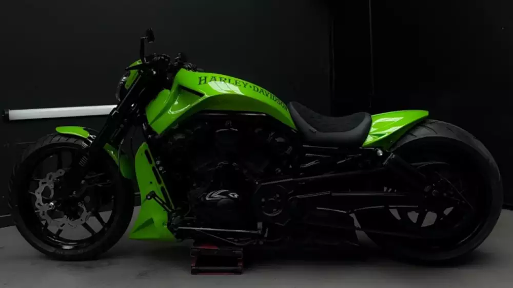 The V-Rod platform has always been about power and presence, and Limitless Custom takes those foundations even further. The low stance, wide rear tire (300) and compact bodywork give this build a modern drag-inspired silhouette, while the blacked-out mechanical components create a sharp contrast against the vivid green finish.