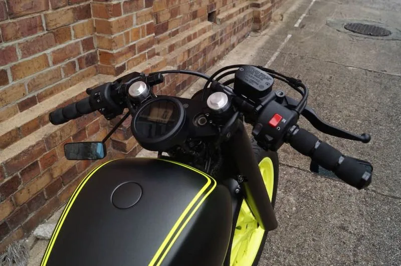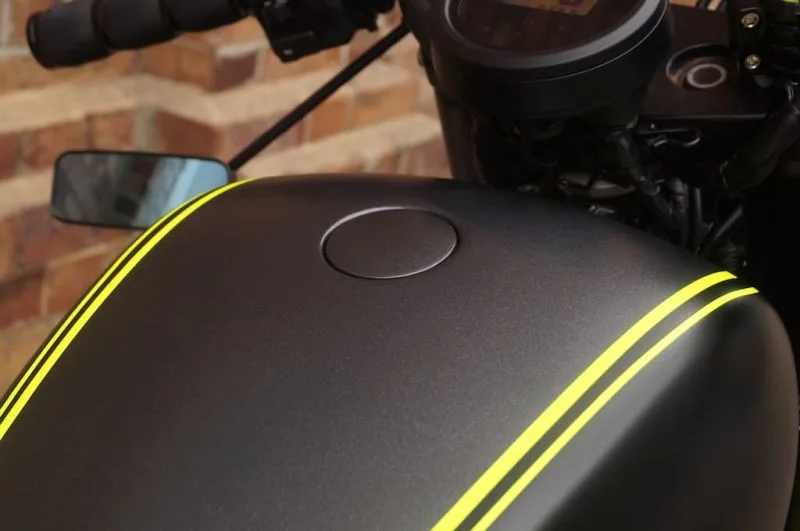 Next the colour scheme – matching yellow pinstripes as highlights to compliment the powdercoated wheels, matte black sides, and a matte charcoal finish on the top of the tank.