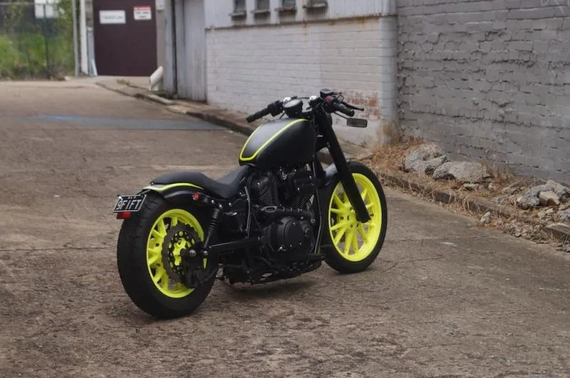 When our client initially proposed the colour scheme for this bike, suffice to say I was not too enthusiastic… “Fluoro Yellow – are you sure, dude??” The last thing he wanted was a “YamaHarley”, so yeah – he was sure. Beefy, low, mean, black, aggressive… all key descriptives used in the brief. And Fluoro Yellow Wheels. Yep.